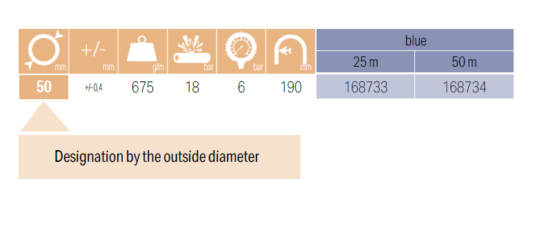 Spiral hoses may exhibit elongation under pressure, which can become significant at temperatures above 40°C. This should be considered prior to installation. For further information, please contact us.